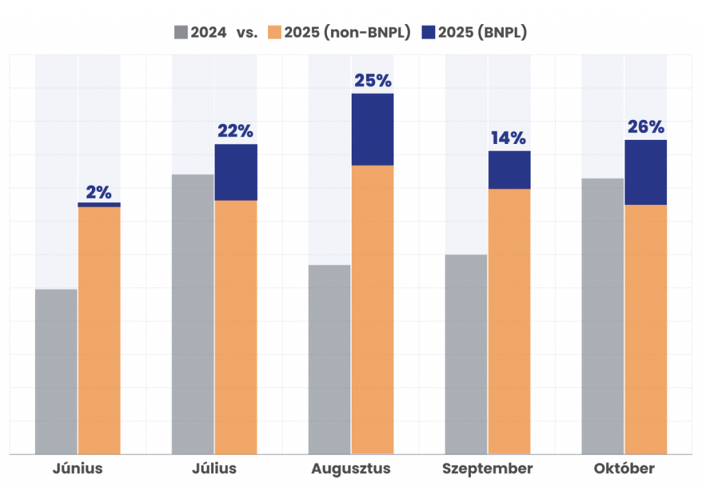 Ráadásul a részletfizetés egyértelműen extra értékesítést eredményezett, nem kannibalizálta az eddigi értékesítéseket. Ehhez megvizsgáltuk az előző év ugyanezen időszakát, így jól látható, hogy a BNPL tranzakciók addicionális értékesítésként jelentkeznek.