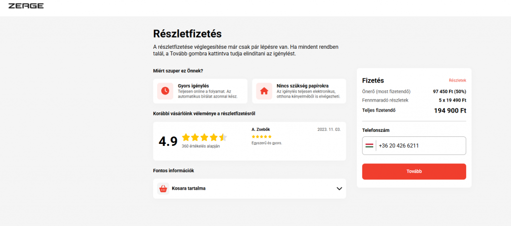 A Zerge.hu-n bevezetett részletfizetési megoldás gyorsaságát és egyszerűségét már közel 100 vásárló értékelte, és 90%-uk 5 csillagos visszajelzést adott. Íme néhány kiemelt vélemény a vásárlóktól: