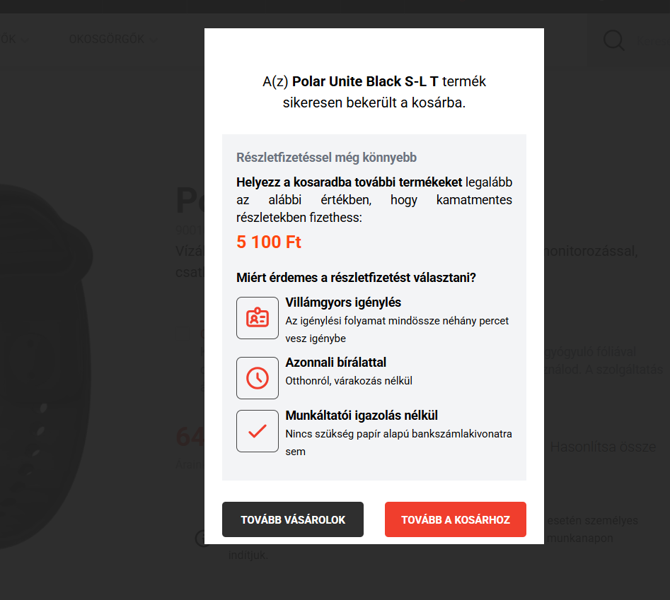 A kosárba helyezés után egy automatikusan megjelenő pop-up abban segíti a vásárlót, hogy pontosan tudja, mennyi további terméket kell még hozzáadnia a rendeléséhez ahhoz, hogy élhessen a részletfizetéssel. Az üzenet lehetőséget biztosít arra is, hogy egy kattintással böngésszen a további releváns termékek között.