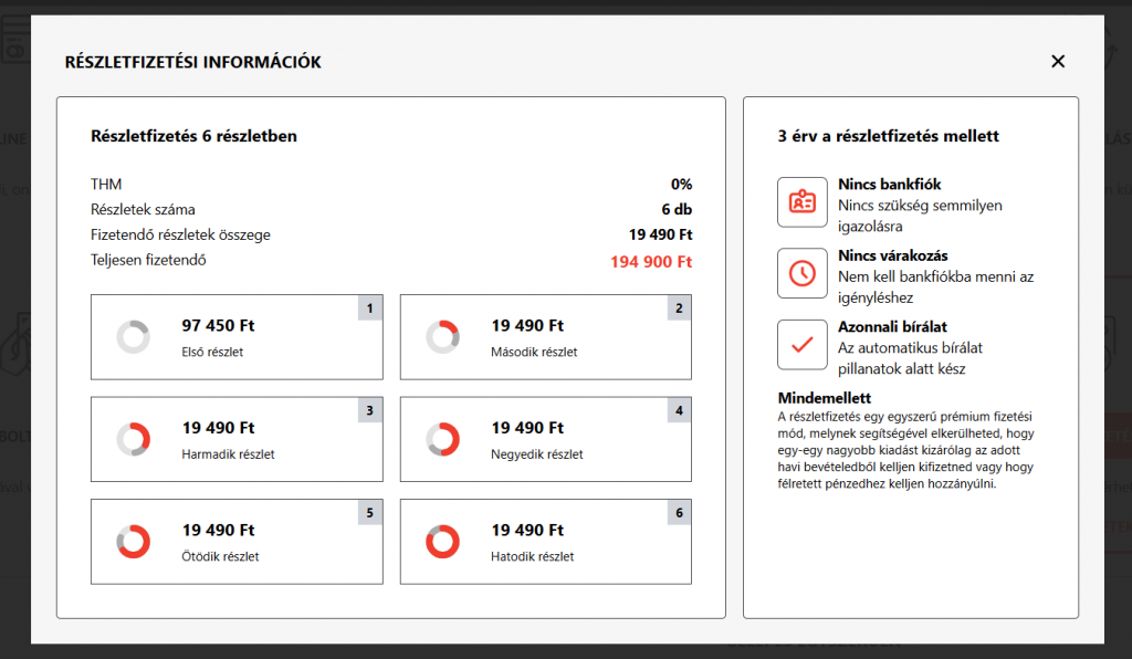 - Láthatóság és Egyértelműség – A részletfizetési lehetőség jól láthatóan, a többi fizetési mód között szerepeljen, kiemelve a legfontosabb előnyöket, például az alacsony havi törlesztőrészleteket és a gyors elbírálást.